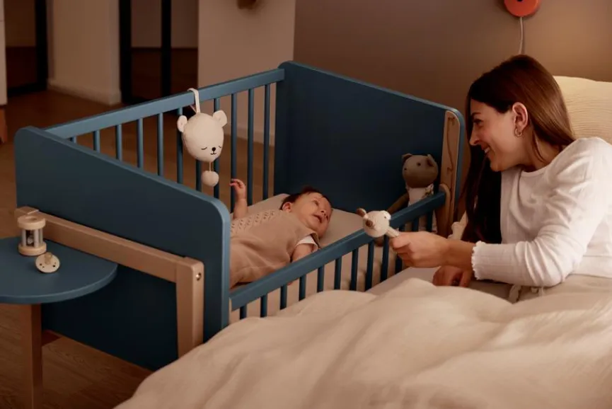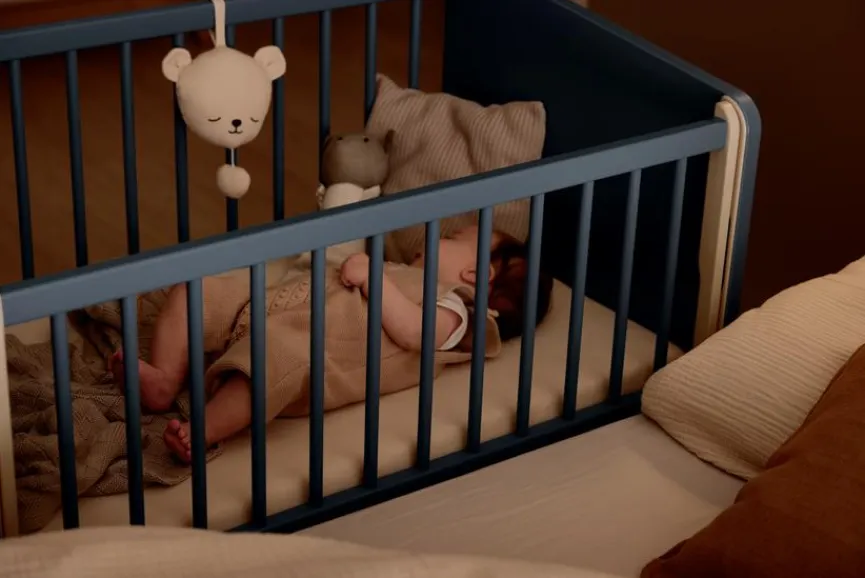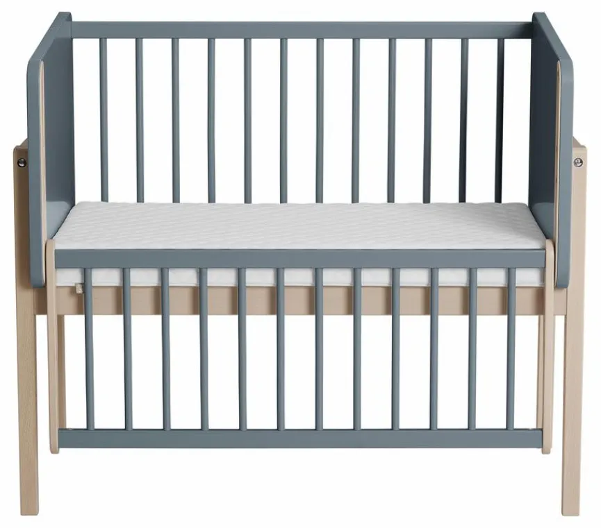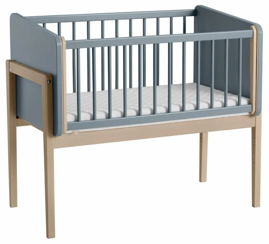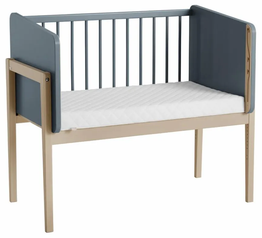- Durch Abmontieren der Gitterseite kann das Beistellbett zum Kindersofa umgebaut werden.