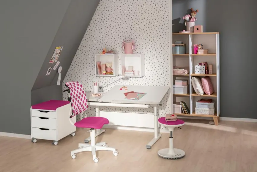 - Stufenlose Sitzhöhenverstellung von 36 – 46 cm mittels speziell für Kinder geeigneter Gasfeder