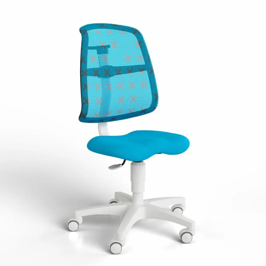 - Sitzbezug aus Stoff in azurblau, Rückenlehne mit atmungsaktivem Netzbezug in azurblau mit „X“ in grau