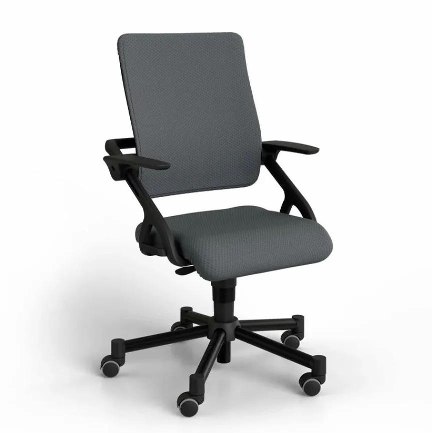 - Bezug aus Stoff in grau, Gestell/Fußkreuz aus Kunststoff in schwarz, Armlehnen aus Kunststoff in schwarz