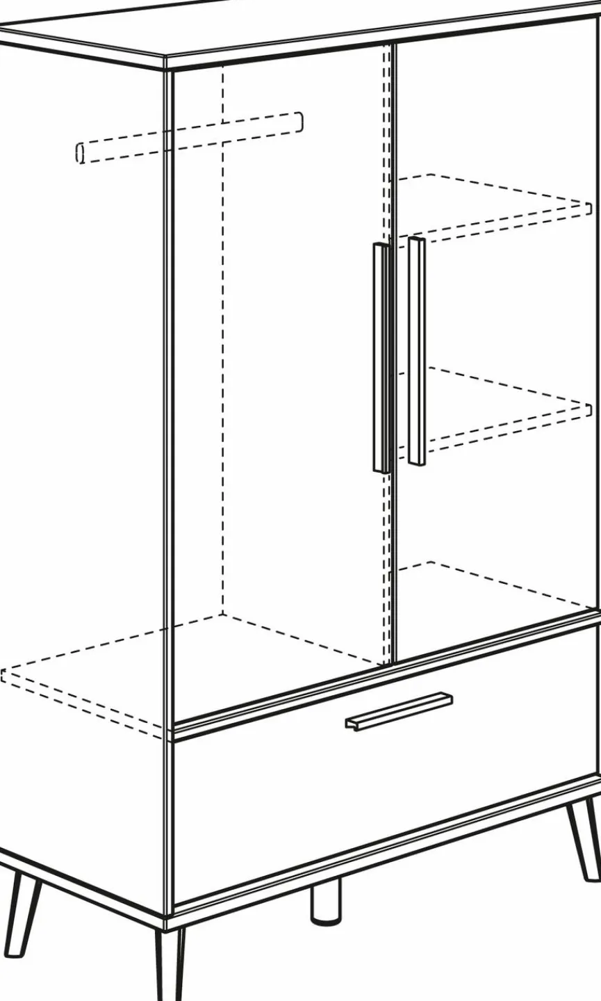- Mit 2 Türen, 1 Schubkasten in Eiche Lamellenoptik, 2 Einlegeböden, 1 Kleiderstange und 1 Mittelwand
