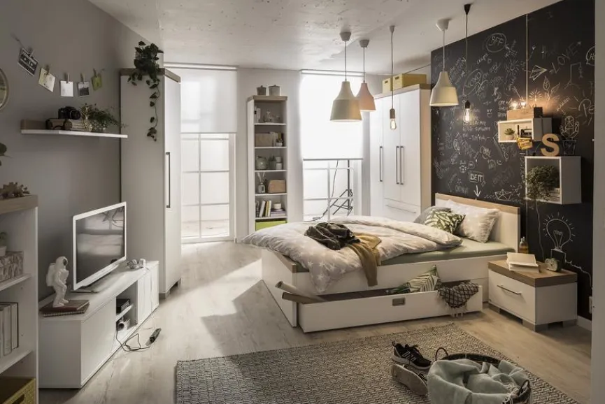 - Mit 3 Türen, 5 Einlegeböden, 1 Kleiderstange, 2 Schubkästen und 1 Mittelwand