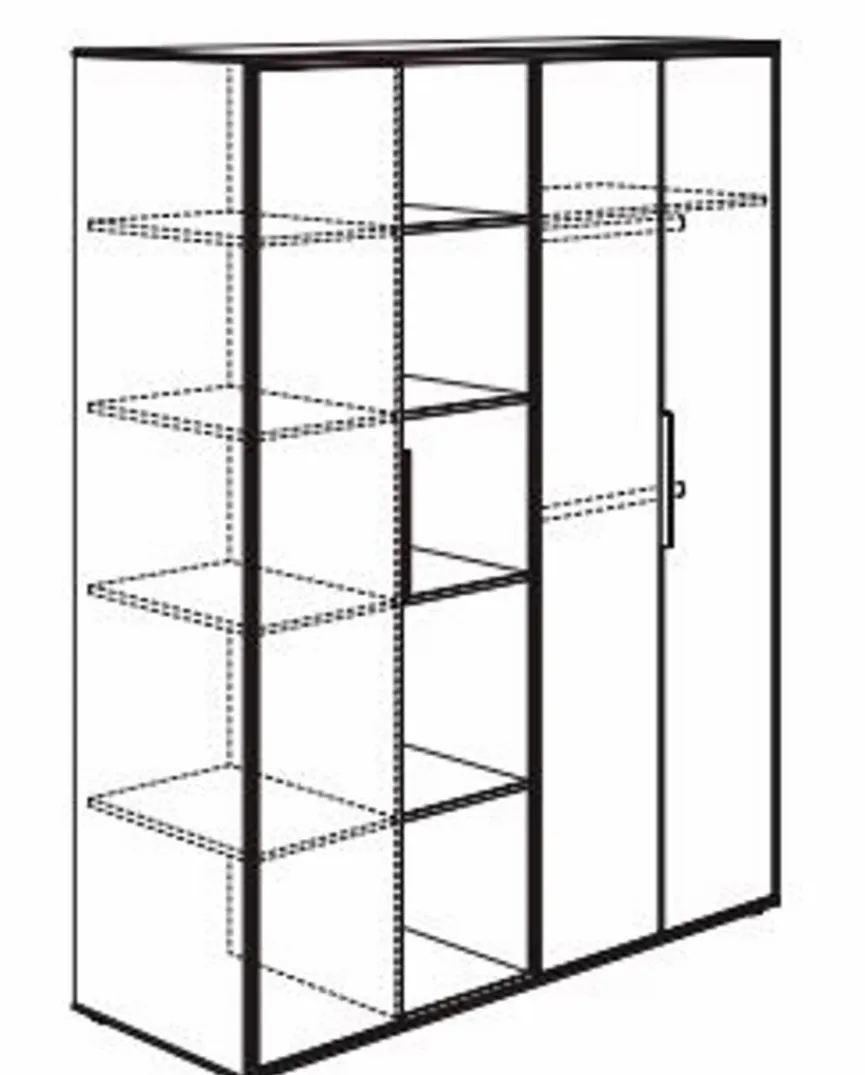 - Links mit 4 schmalen Einlegeböden, 5 offene Fächer mittig, rechts mit 1 breiten Einlegeboden und 2 Kleiderstangen