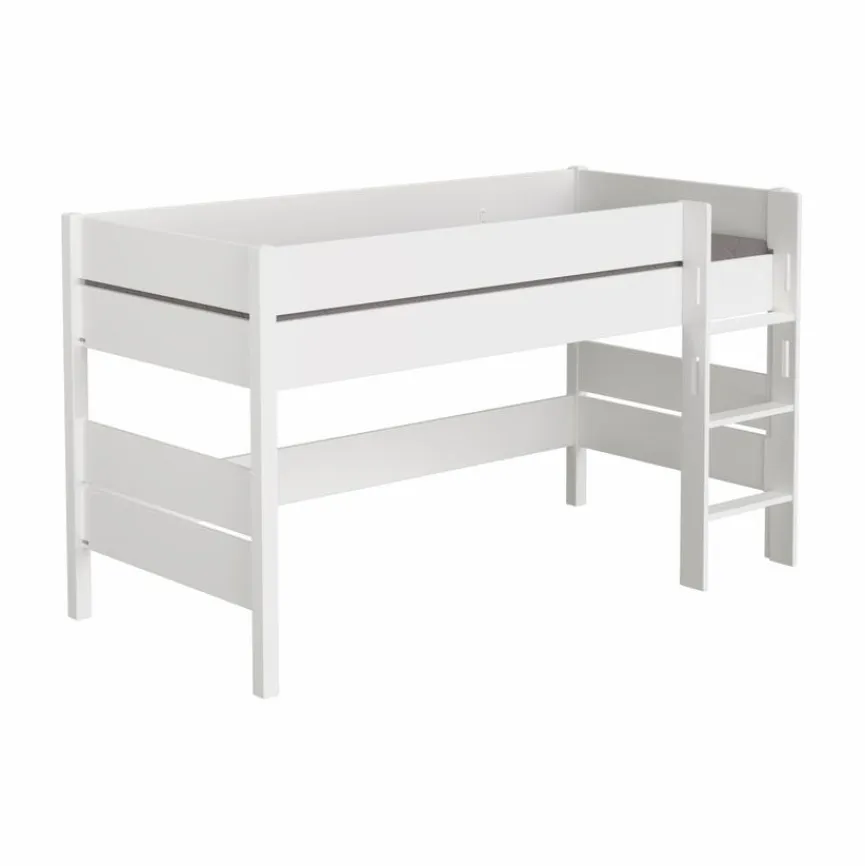 - Aus Holzwerkstoff (Spanplatte) mit kratzfester Melaminharzfolie in kreideweiß, Bettpfosten und Leiter aus massiver und kreideweiß lackierter Buche