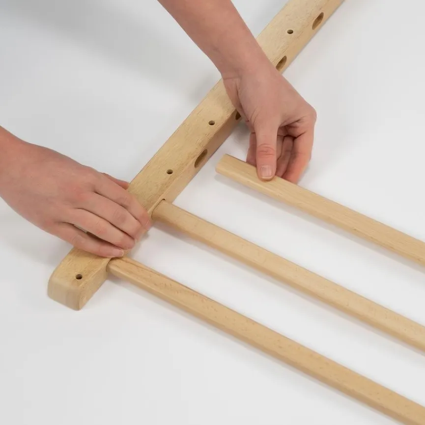 - Aus massiver Buche und massivem Gummibaumholz in natur lackiert, Verschlüsse und Befestigungssystem aus Kunststoff in weiß