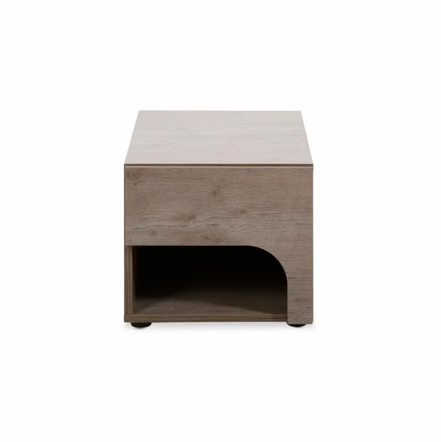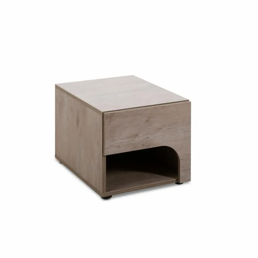Mit seinem abgerundeten Ausschnitt steht der Nachttisch MAX-I von Rudolf für einen zeitgemäßen Look mit originellem Akzent. Diese Nachtkonsole stellt die perfekte Ergänzung zum Bett beziehungsweise zu den anderen Möbeln der Serie MAX-I dar. Der Nachttisch MAX-I aus dem Hause Rudolf ist mit einem Behaglichkeit vermittelnden Dekor in Steineiche-Nachbildung versehen.