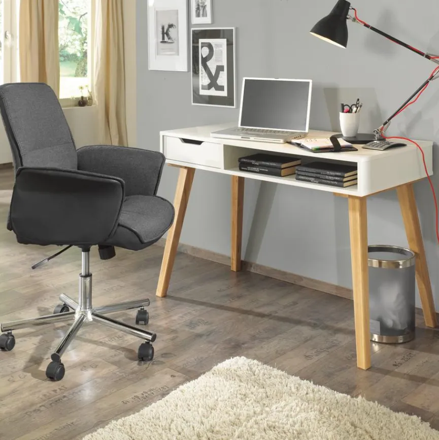 Der Schreibtisch Malmö bringt mit seinem coolen Design Leben in Ihr Zuhause. Die außergewöhnliche Formgebung und der gelungene farbliche Kontrast machen das Möbelstück zu einem echten Hingucker. Ein Schubkasteneinsatz und ein offenes Fach dienen beim Schreibtisch Malmö als praktischer Aufbewahrungsort für verschiedene Gegenstände.