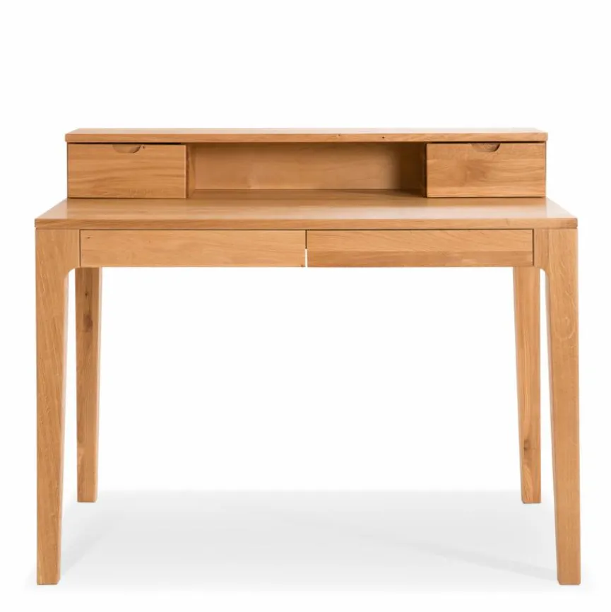 Zeitlos elegant: Der Schreibtisch Oskar begeistert durch sein puristisches Design. Aus massiver Wildeiche gefertigt ist der Tisch aber nicht nur ein optischer Hingucker, sondern überzeugt auch mit hoher Stabilität und natürlicher Robustheit. Zwei Schubladen mit Softclose bieten praktischen, aber unauffälligen Stauraum. Zudem verfügt der Schreibtisch Oskar über einen Aufsatz, der perfekt als Ablage genutzt werden kann.