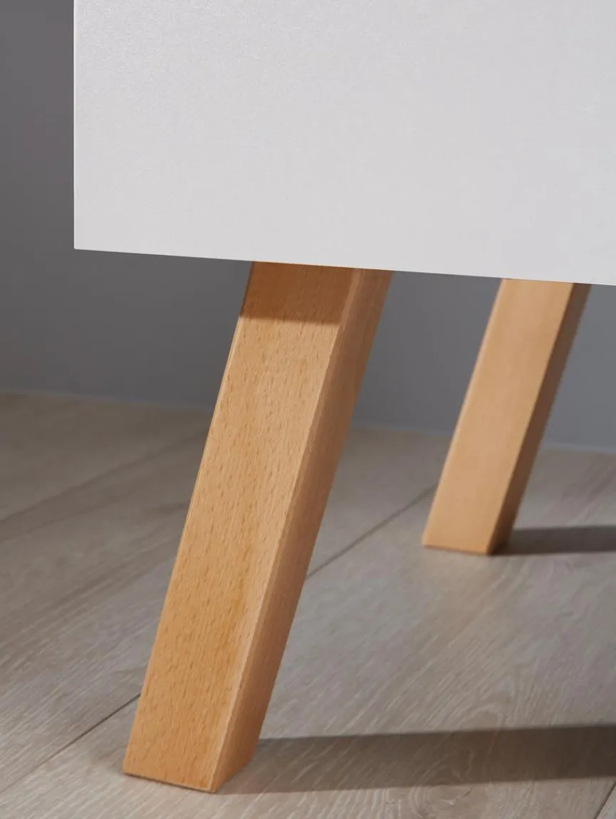 - Aus Holzwerkstoff (Spanplatte) mit kratzfester Melaminharzfolie in weiß , Gitterseiten, Lattenrost, Griffe und Füße aus massiver Buche