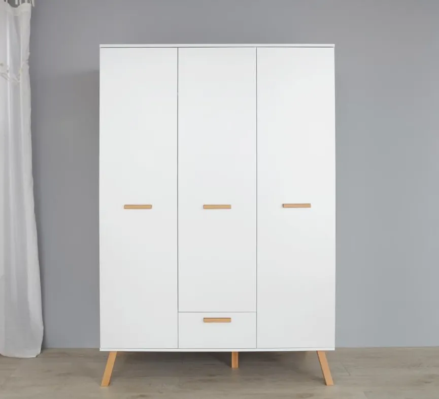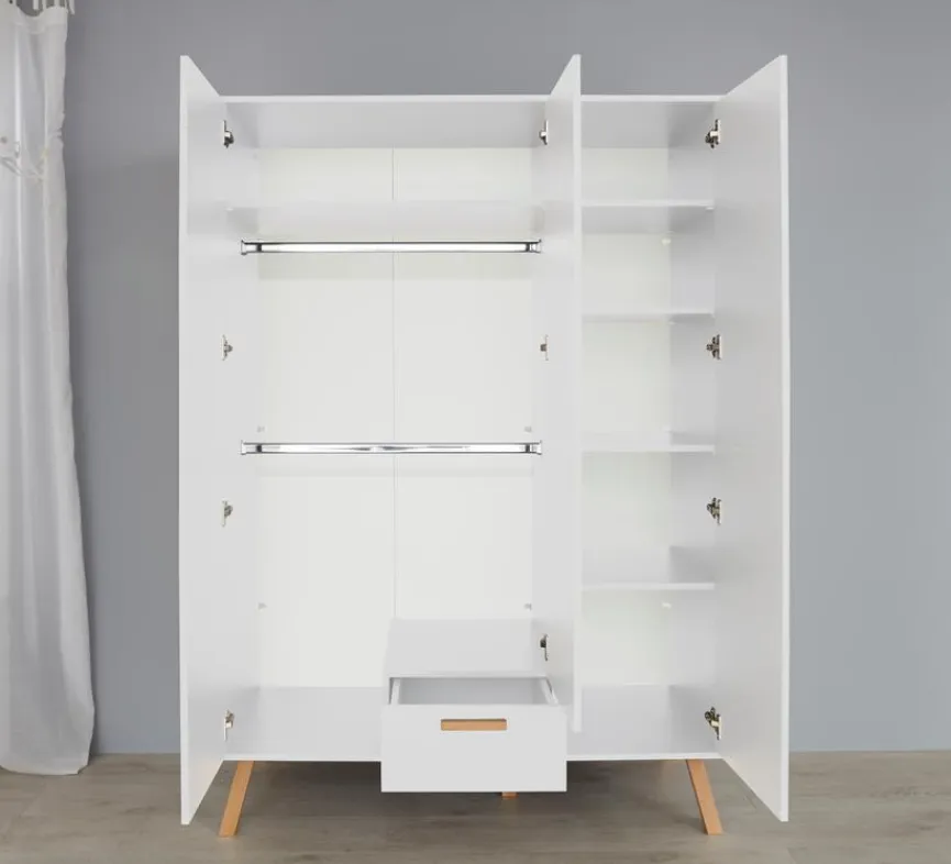 - Kleiderschrank mit 3 Türen, 4 schmalen und 1 breiten Einlegeboden, 2 Kleiderstangen und 1 Schubkasten