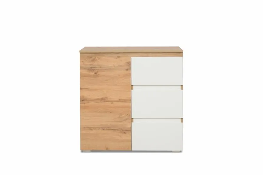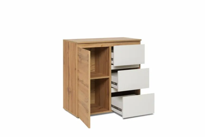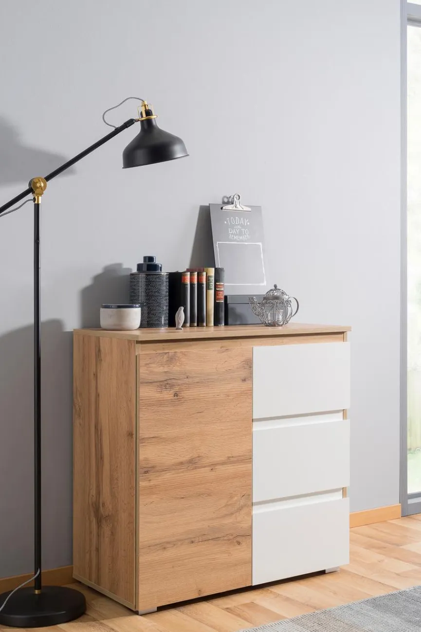 Mit ihrer Kombination aus natürlicher Holznachbildung und hellen Schubladen ist die Kommode Image ein toller optischer Blickfang und lässt sich perfekt in jeden Raum integrieren. Viel Stauraum findet sich in drei Schubkästen sowie hinter einer Tür mit praktischem Einlegeboden. Die Kommode Image schafft überall eine wohlige und freundliche Wohnatmosphäre.
