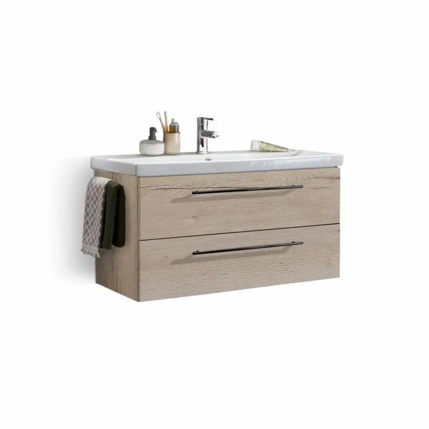- Bestehend aus Waschtischunterschrank FWUK96 mit 2 Auszügen, Griffe Schwarz matt,