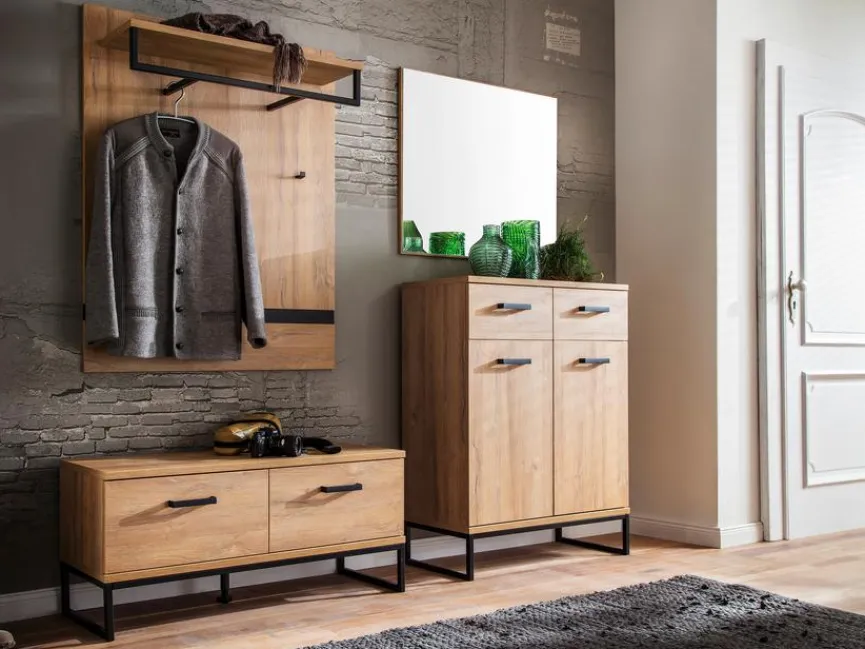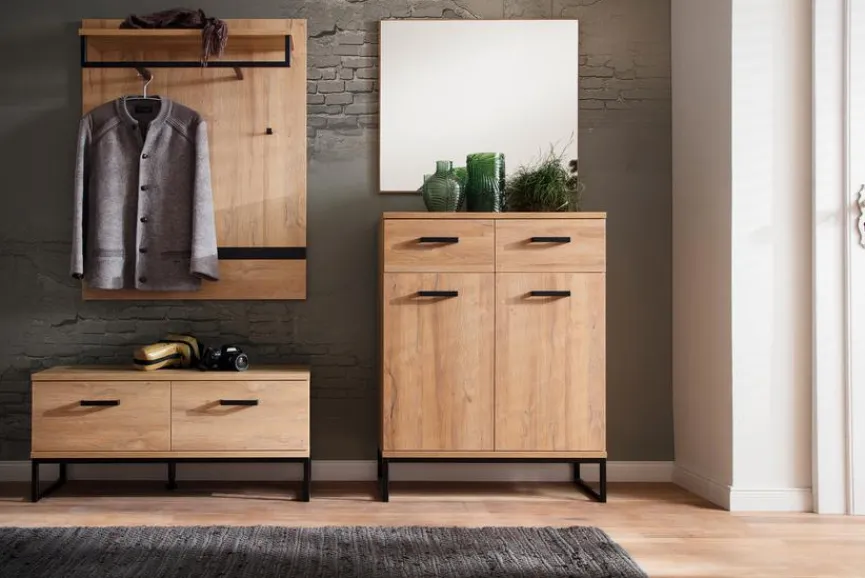- Garderobe aus Schuhschrank, Spiegel, Garderobenbank und Garderobenpaneel