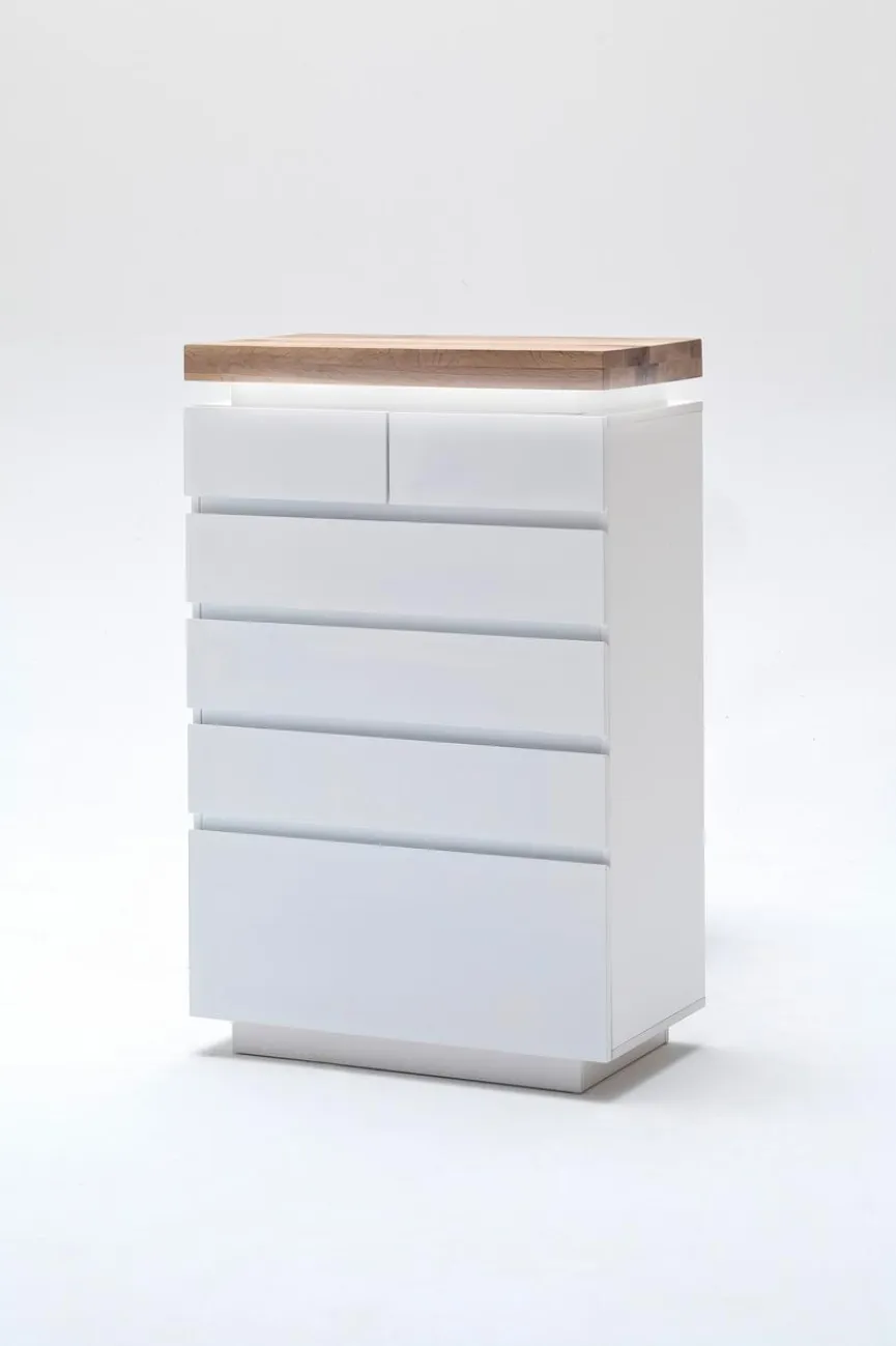 MCA präsentiert mit der kompakten Kommode Romina ein attraktives Möbelstück, das jede Einrichtung bereichert und für zusätzlichen Stauraum sorgt. Ein besonderes Highlight stellt die dimmbare LED-Beleuchtung dar, die sich unterhalb der Deckplatte befindet und mittels einer Fernbedienung den persönlichen Präferenzen angepasst werden kann. Auf der Oberseite der hochwertigen Kommode Romina lassen sich dekorative Objekte oder andere Dinge platzieren.