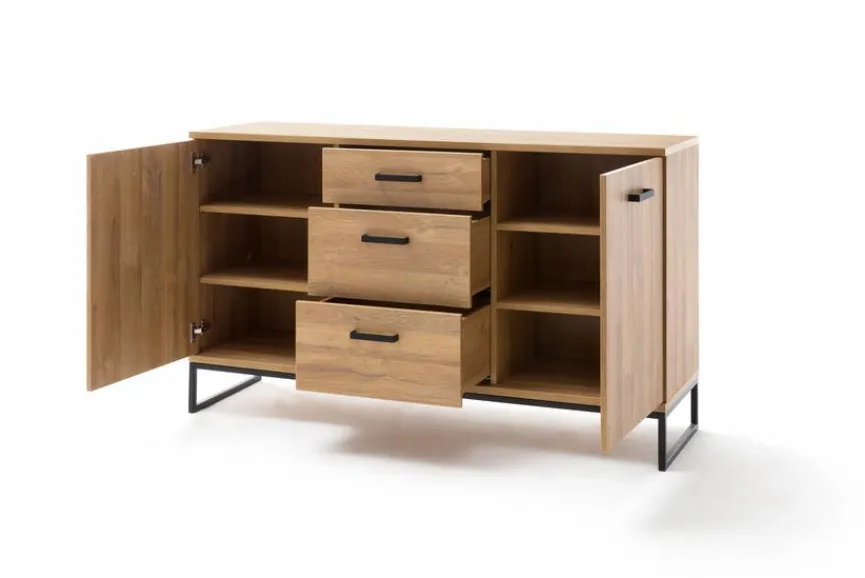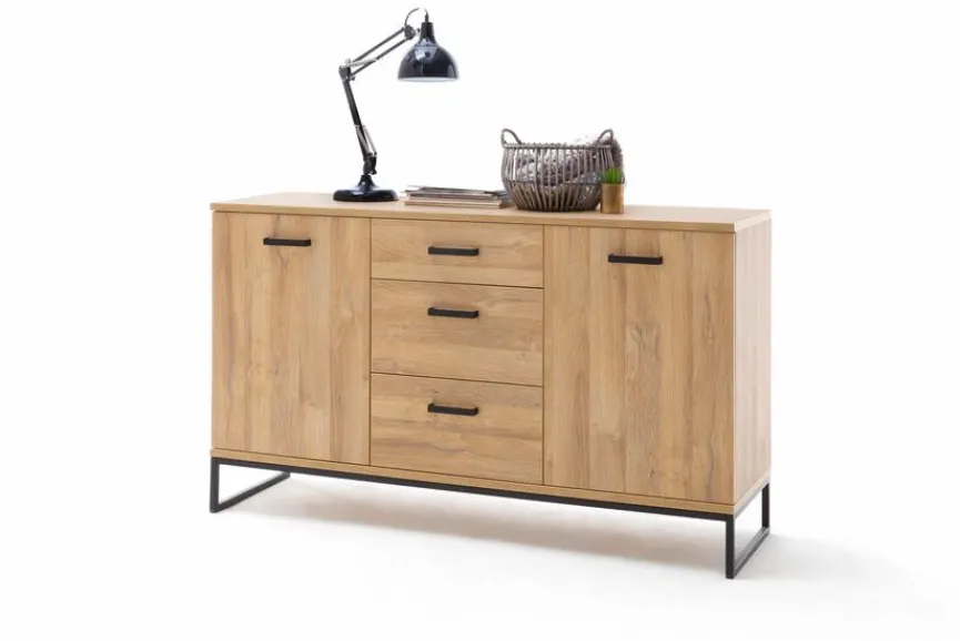 Die Kommode Toledo von MCA passt hervorragend in ein Wohnumfeld, das von geradlinigen Möbeln mit gemütlicher Note geprägt ist. Während das kantige Gestell sowie die schlichten Bügelgriffe der Kommode Toledo aus dem Hause MCA mit einem matten Schwarz aufwarten, sind der Korpus und die Front in Grandson Oak Melamin gestaltet.