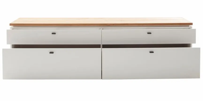 - Korpus und Front aus Holzwerkstoff (Spanplatte) mit Lack in Soft White, Absetzung aus Holzwerkstoff (Spanplatte) Ast/Balkeneiche furniert in Wildeiche geölt