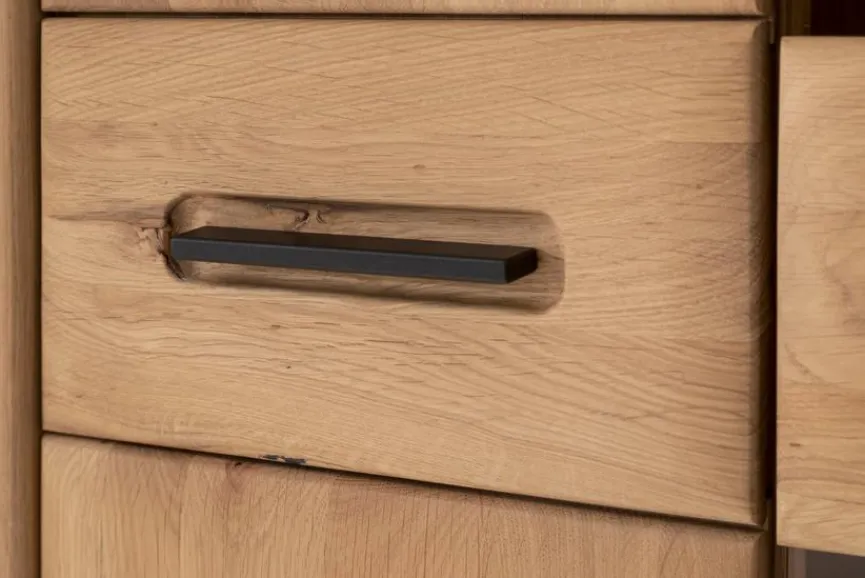 - Korpus aus Holzwerkstoff (Spanplatte) Ast/Balkeneiche furniert in Kristalleiche geölt, Front aus Ast/Balkeneiche massiv durchgehende Lamelle in Kristalleiche geölt