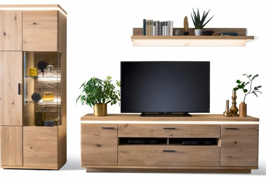 - LED-Beleuchtung vom Oberboden vom TV-Lowboard und der Vitrine ist inklusive. Sonstige Beleuchtung und Zubehör ist optional gegen Mehrpreis erhältlich