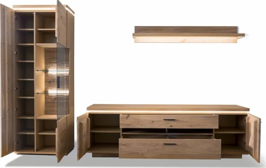 - Lowboard mit 2 Türen und 2 Schubkästen mittig, Vitrine mit 2 Türen, 11 Holzböden und 2 Glaseinlegeböden, Wandboard mit 1 Ablageboden, inkl. Türdämpfung und gedämpfte Schubkästen