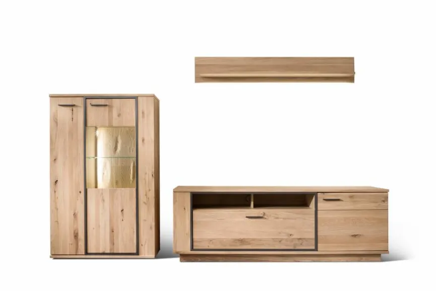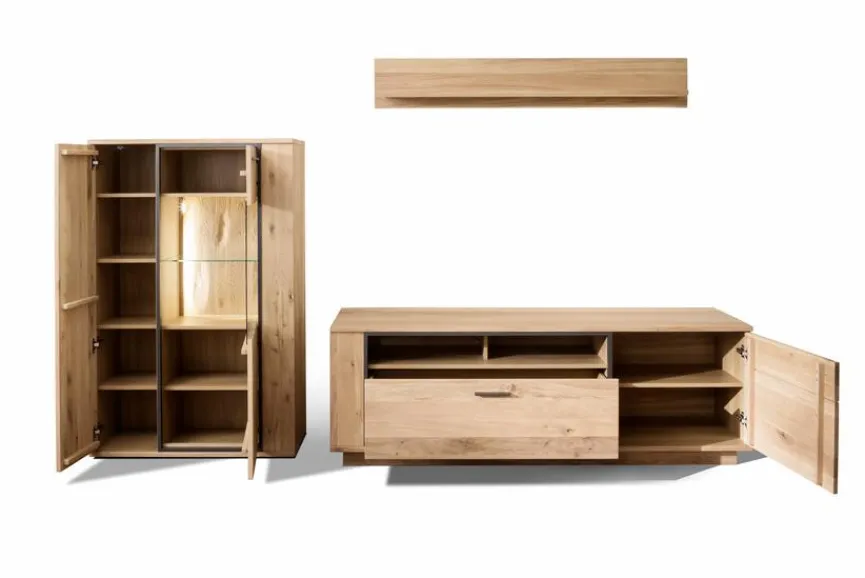 Die Wohnwand Campinas 3tlg. besteht aus einem großzügigen TV-Lowboard, einem Vitrinenschrank und einem Wandregal. Die Oberfläche ist aus Eiche Dekor und verleiht Ihrem Wohnzimmer einen gemütlichen, rustikalen Look. Und das Beste – Die Wohnwand Campinas 3tlg. Bietet ausreichend Stauraum für all Ihre Lieblingsdinge.