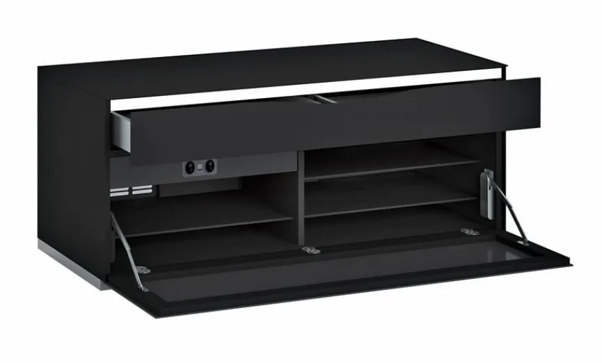 Das TV-Lowboard Modena ist mit seinem schwarz-glänzenden Korpus und der Front ein wirklicher Eye-Catcher. Fünf Glasböden im Inneren des TV-Unterschranks bieten ausreichend Platz zum Verstauen der Technik. Mit seinen acht versteckbaren Rollen kann das TV-Lowboard Modena einfach und ganz nach Belieben neu platziert werden.