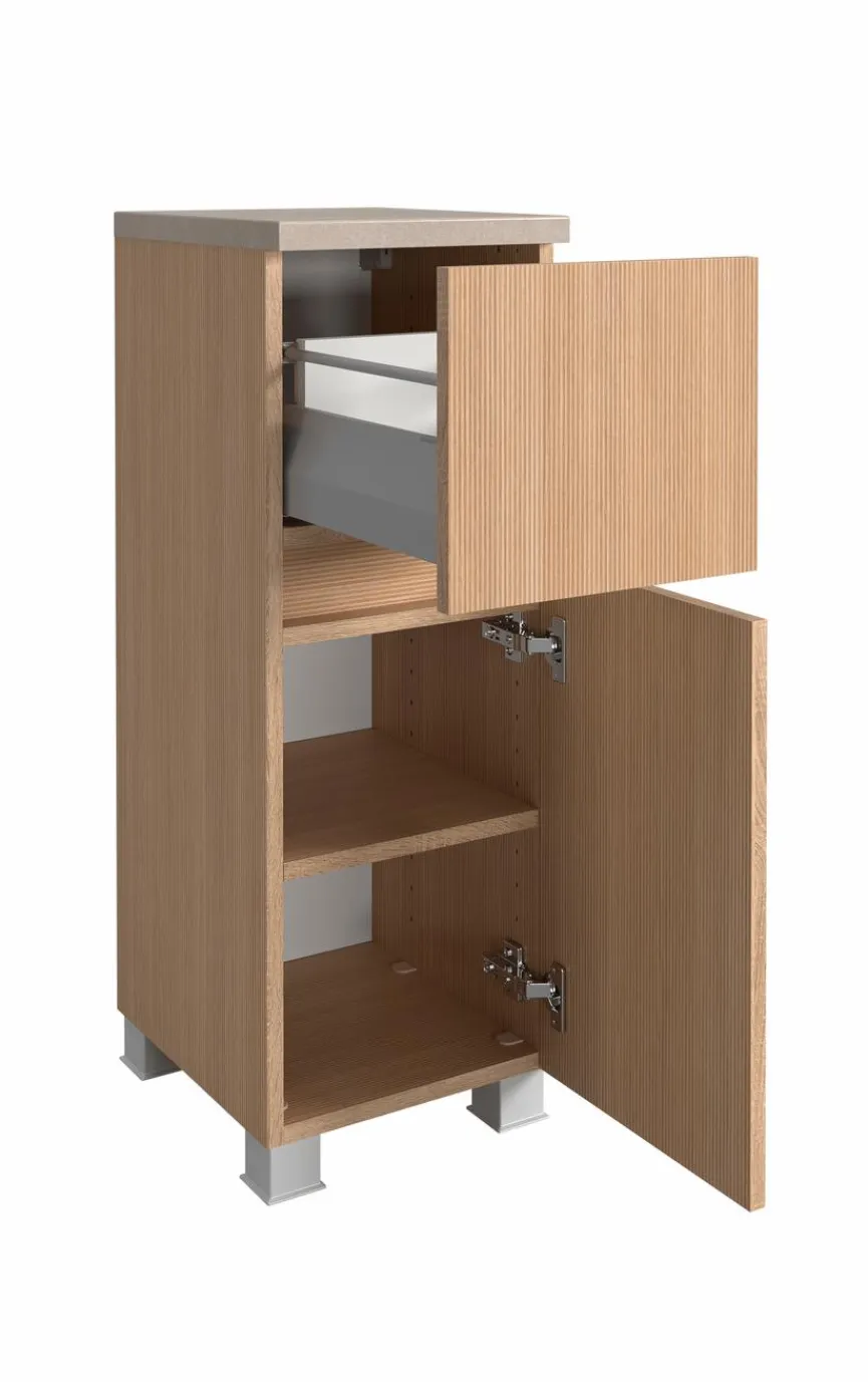 - Mit 1 Türe inkl. 1 Einlegeboden (Belastbarkeit Einlegeboden bis max. 5kg) und 1 Auszug mit Softclose-Funktion, mit gedämpften Scharnieren – Türanschlag links oder rechts