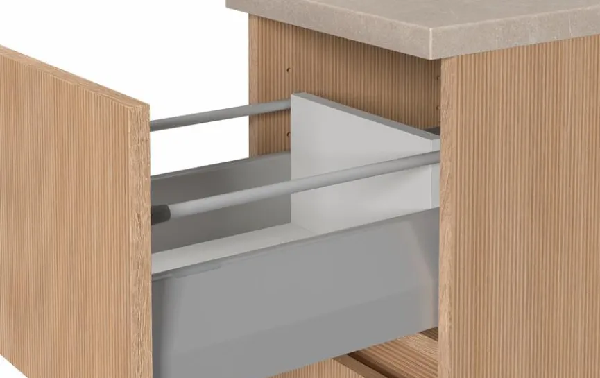 - Front und Korpus aus Holzwerkstoff (Spanplatte) mit kratzfester Melaminharzfolie in Eiche hell