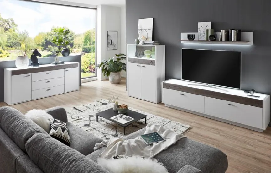 - Korpus aus Holzwerkstoff (Spanplatte) mit kratzfester Melaminharzfolie in „Modern White“, Front aus Holzwerkstoff (MDF) mit hochwertiger Dekorfolie in „Modern White“, Front-Absetzung in Kastanie Echtholz furniert, Sichtbare Rückwände in Vulcano glatt