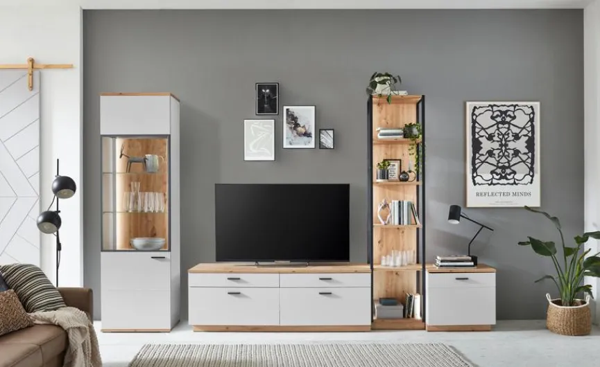 - Aus Holzwerkstoff (Spanplatte) mit kratzfester Melaminharzfolie in Modern White, Absetzung aus Holzwerkstoff (Spanplatte) mit kratzfester Melaminharzfolie in Eiche Artisan