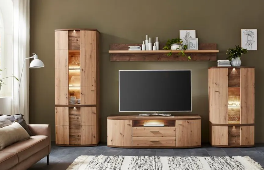 - Wohnwand aus Vitrine, TV-Lowboard, Highboard und Wandboard