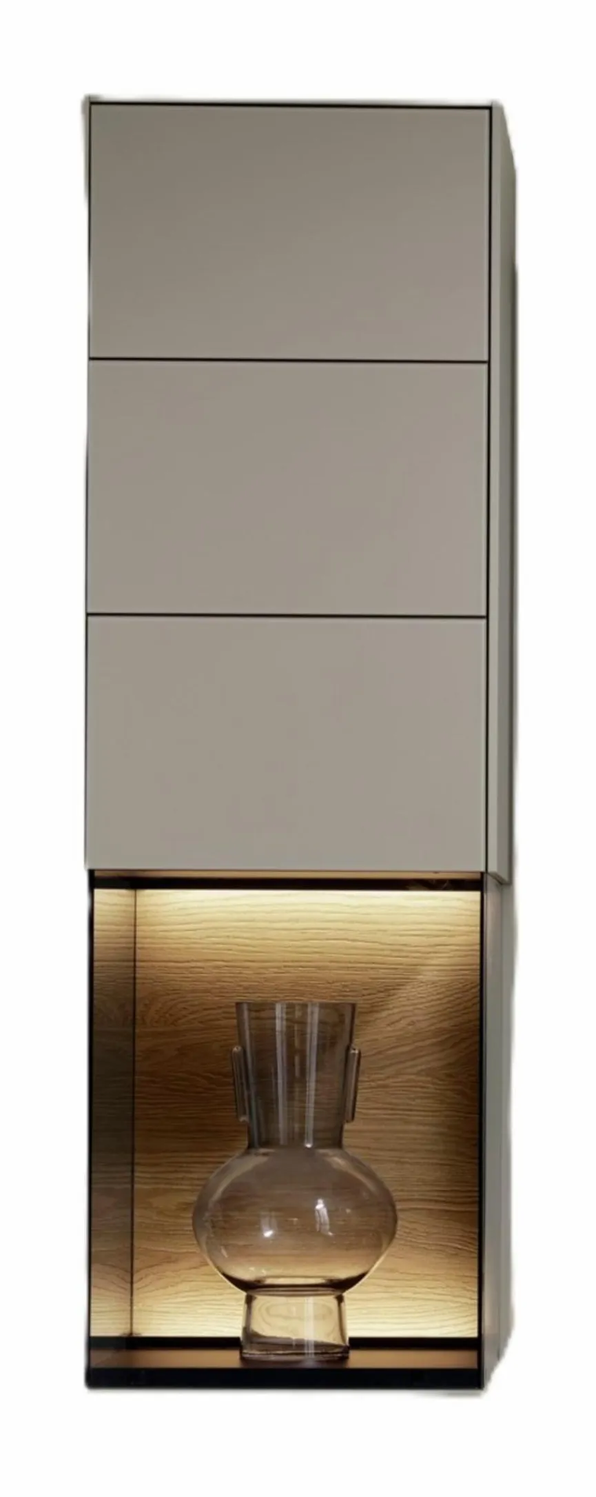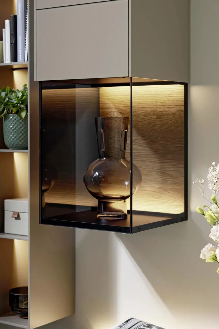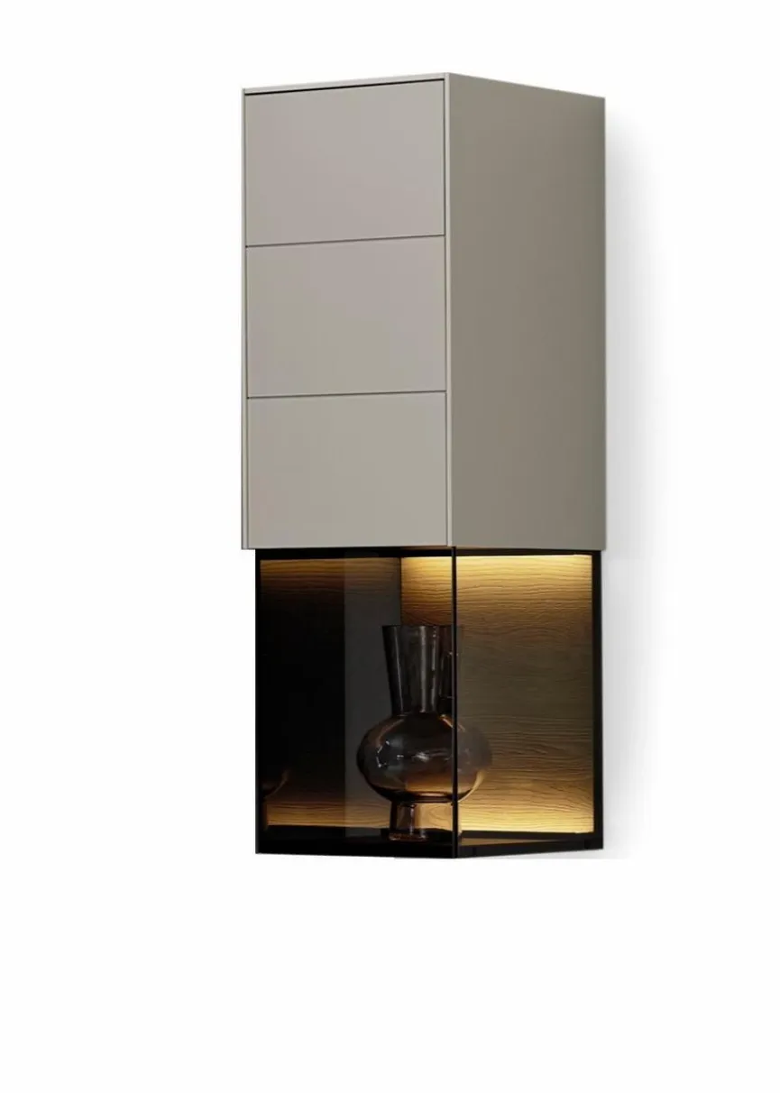 Der Hängeschrank Q-Media 2.0 von Musterring benötigt keine Stellfläche und gehört zu einer stilvollen Kollektion, die sich durch eine hochwertige Verarbeitung und hohe Ansprüche ans Design auszeichnet. Im gläsernen unteren Teil des eleganten Möbels können Sie besonders schöne Objekte präsentieren. Im oberen Abschnitt weist der Hängeschrank Q-Media 2.0 hinter einer Tür drei Fächer auf, die als Stauraum dienen.