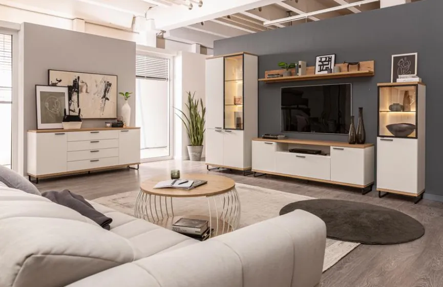 - Korpus und Front aus Holzwerkstoff (Spanplatte) mit kratzfester Melaminharzfolie in Polarweiß, Absetzung aus Holzwerkstoff (Spanplatte) mit kratzfester Melaminharzfolie in Artisan Eiche