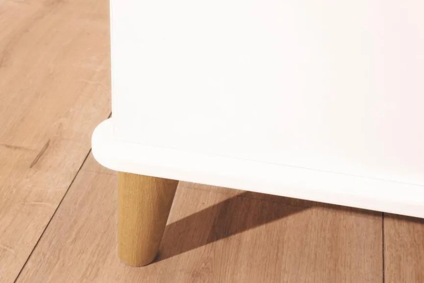 - Aus Holzwerkstoff (Spanplatte) mit kratzfester Melaminharzfolie in weiß, Füße und Zierleiste aus massiver und lackierter Eiche