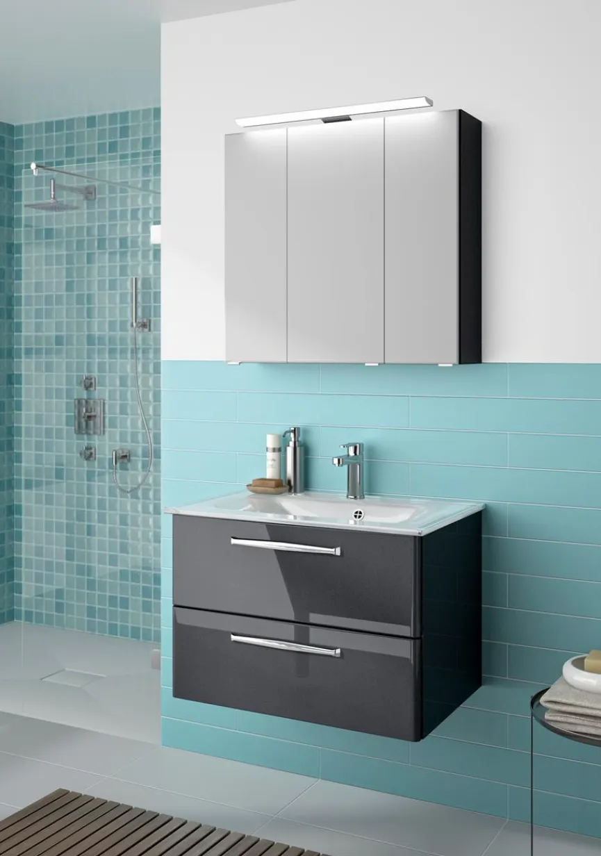 Spiegelschrank: B/H/T ca. 75x70x20 cm, Waschtischunterschrank: B/H/T ca. 75x51x49 cm, Glaswaschtisch: B/H/T ca. 77×1,5×50 cm