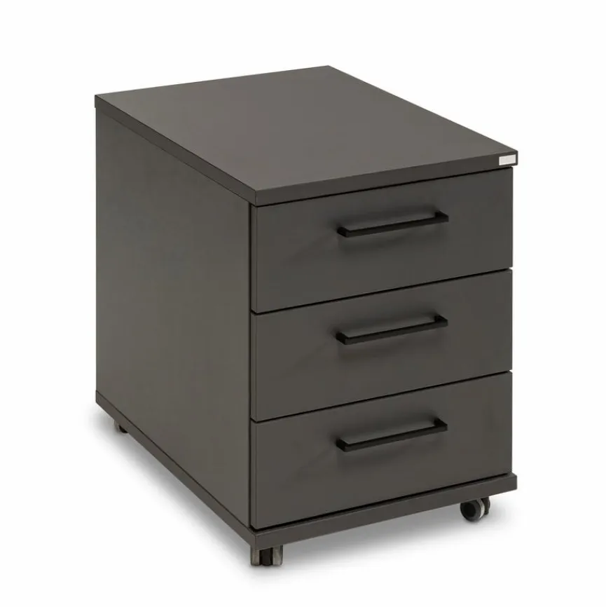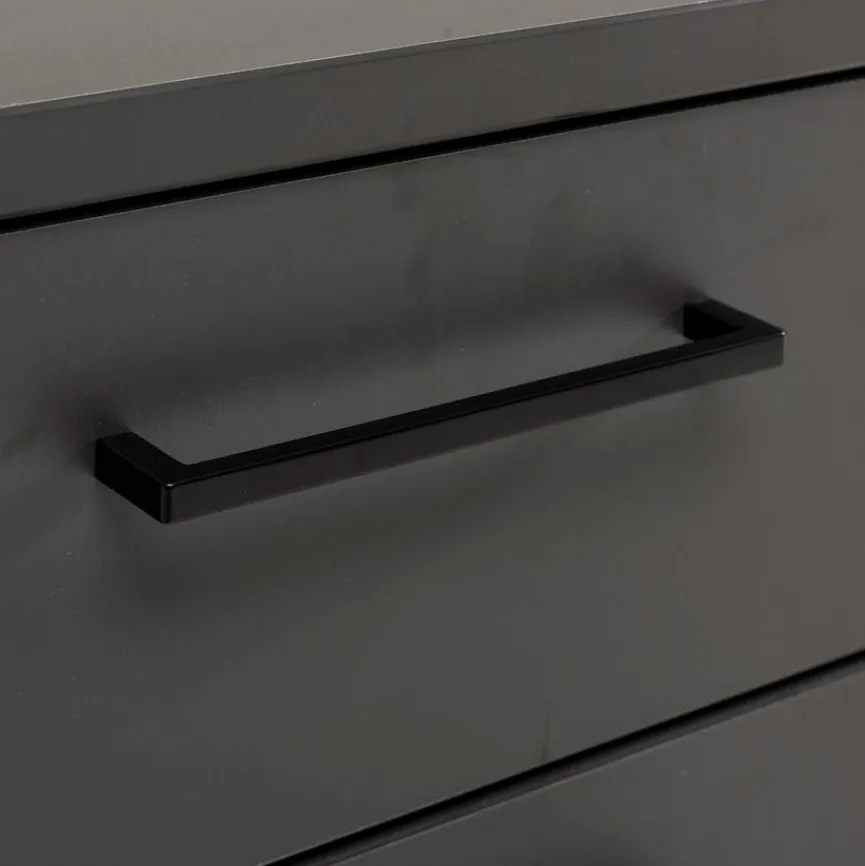 - Aus Holzwerkstoff (Spanplatte) mit kratzfester Melaminharzfolie in Graphit matt, Griffe aus Metall in anthrazit
