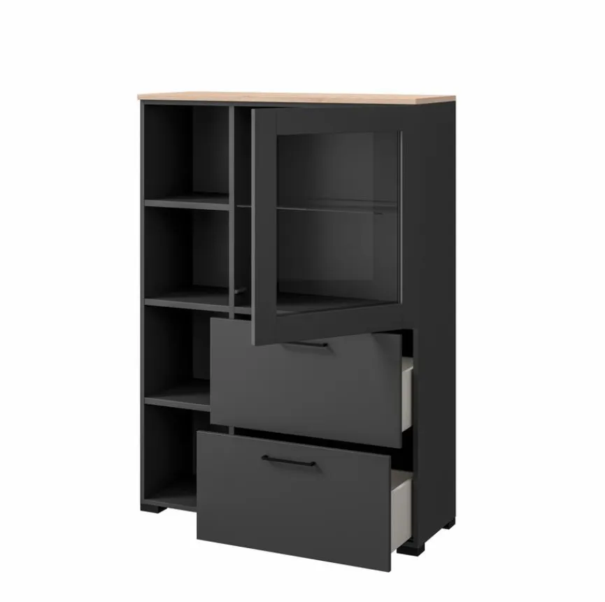 - Mit 1 Glastüre, 1 Glaseinlegeboden, 3 festen Fachböden und 2 Schubkästen