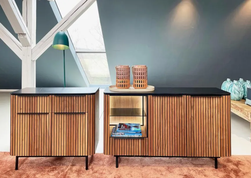 Aufgrund ihres angesagten Lammellen-Designs ist die Kommode Pannelli ein echter Hingucker im Wohnbereich, der Ihren modernen Einrichtungsstil gekonnt unterstreicht. Jedoch sieht das Möbelstück nicht nur stylisch aus, sondern es sorgt auch dank seiner cleveren Innenausstattung für eine aufgeräumte Atmosphäre. So bietet die Kommode Pannelli einen durchgehenden Einlegeboden hinter den Türen sowie 2 praktische Schubladen, wo Sie Ihre Utensilien unterbringen können.
