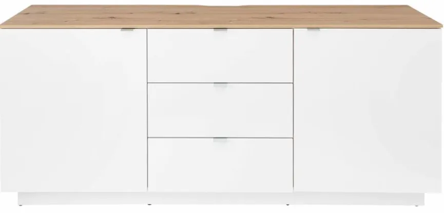 - Korpus aus Holzwerkstoff (Spanplatte) mit kratzfester Melaminharzfolie in Weiß, Front aus Holzwerkstoff (MDF) mit Tiefziehfolie in Weiß, Absetzung aus Holzwerkstoff (Spanplatte) mit kratzfester Melaminharzfolie in Artisan Eiche Nachbildung