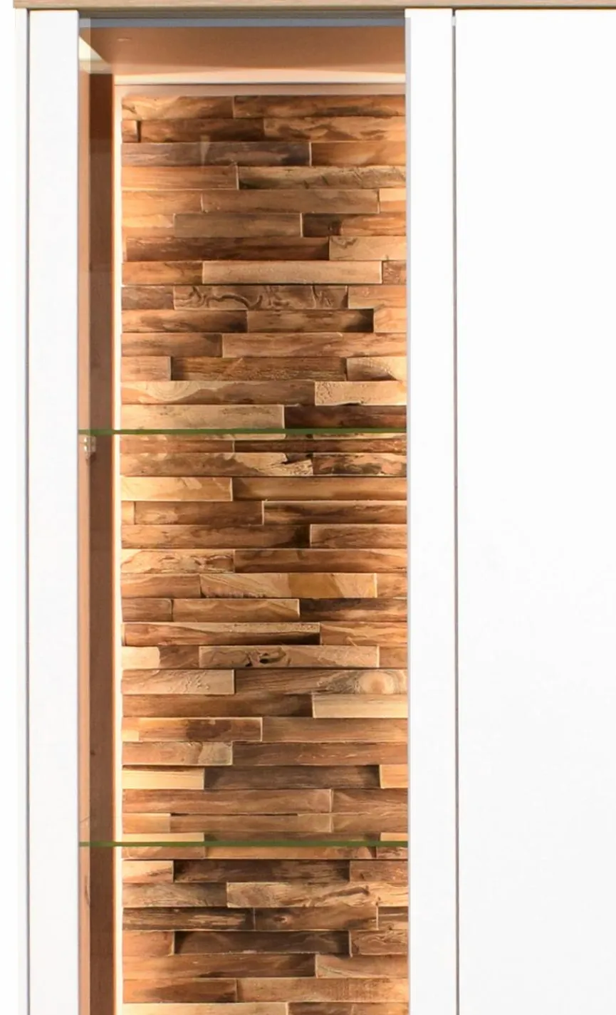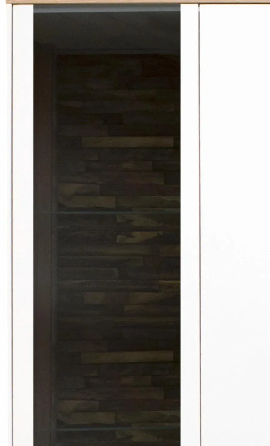 - Aus Holzwerkstoff (Spanplatte) mit kratzfester Melaminharzfolie in ice white supermatt mit Absetzung in Asteiche Nachbildung