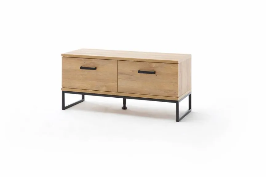 Die MCA Garderobenbank Toledo ist Teil des Garderobenmöbelprogramms Toledo und kann auch einzeln erworben werden. Hinter zwei Klappen bietet sie praktische Abstellmöglichkeiten für Haus- und Straßenschuhe. Der stabile Oberboden der Umkleidebank lädt zum Platznehmen ein. Zwei seitliche Metall-Kufenfüße und ein zusätzlicher Stützfuß aus Metall verleihen der MCA Garderobenbank Toledo einen kippsicheren Stand.