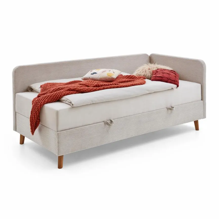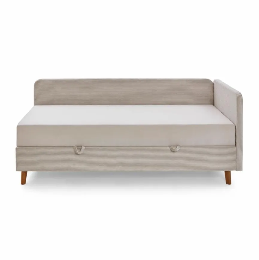 - Bettgestell aus Holzwerkstoff, Füße aus Massivholz in eichefarbig, Bezug aus Cord-Stoff in beige