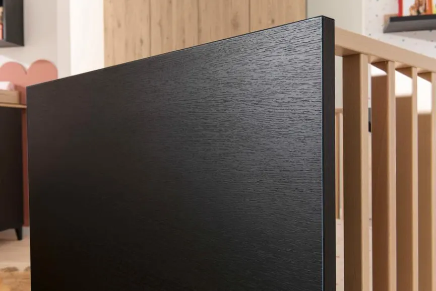 - Betthäupter aus Holzwerkstoff (Spanplatte) mit kratzfester Melaminharzfolie in Naturschwarz, Gitterseiten aus Buche massiv