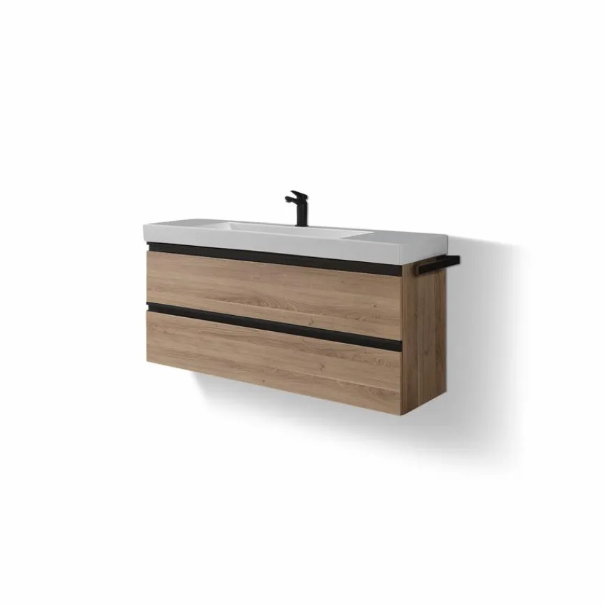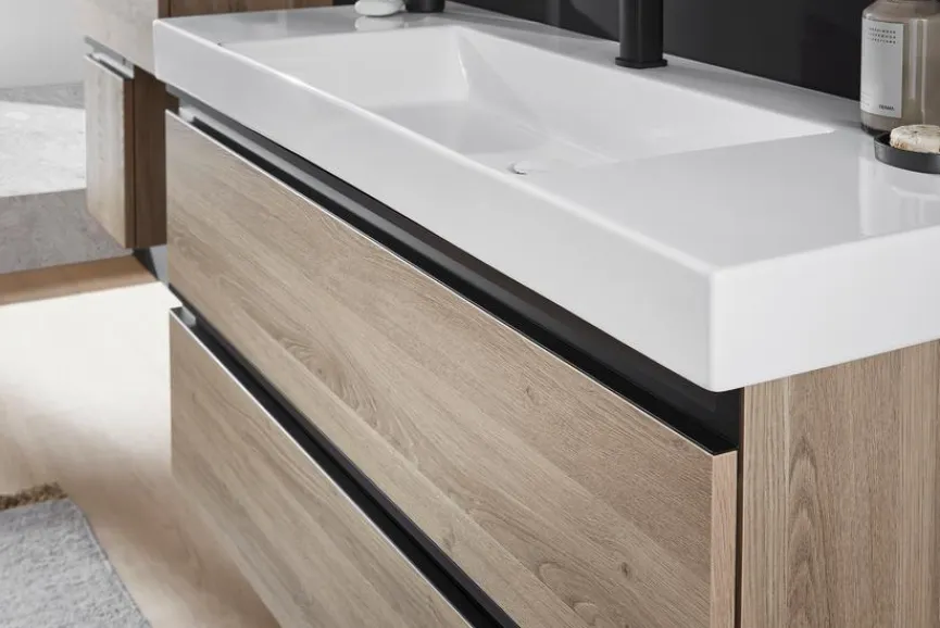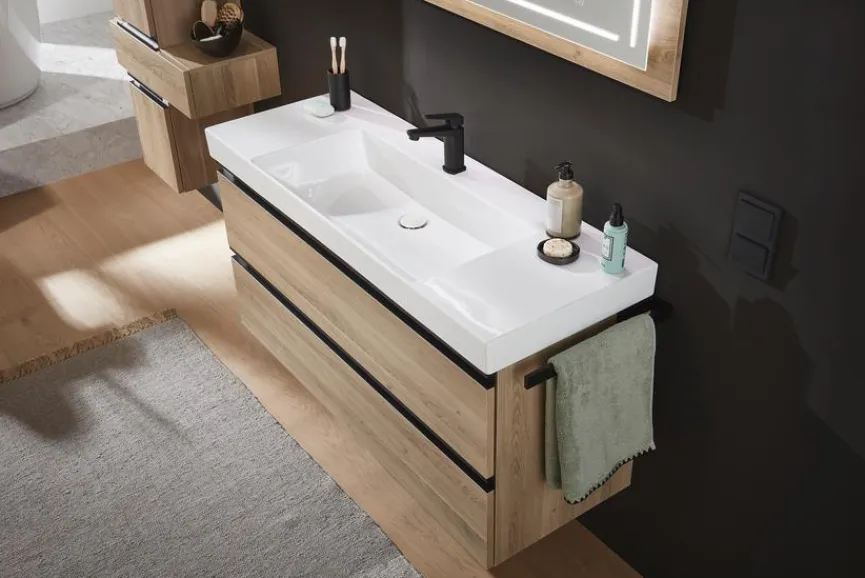 - Mit Waschtischunterschrank inkl. 1 Metallauszug mit Einzugsdämpfung und Siphonausschnitt und 1 Metallauszug mit Einzugsdämpfung und Reling