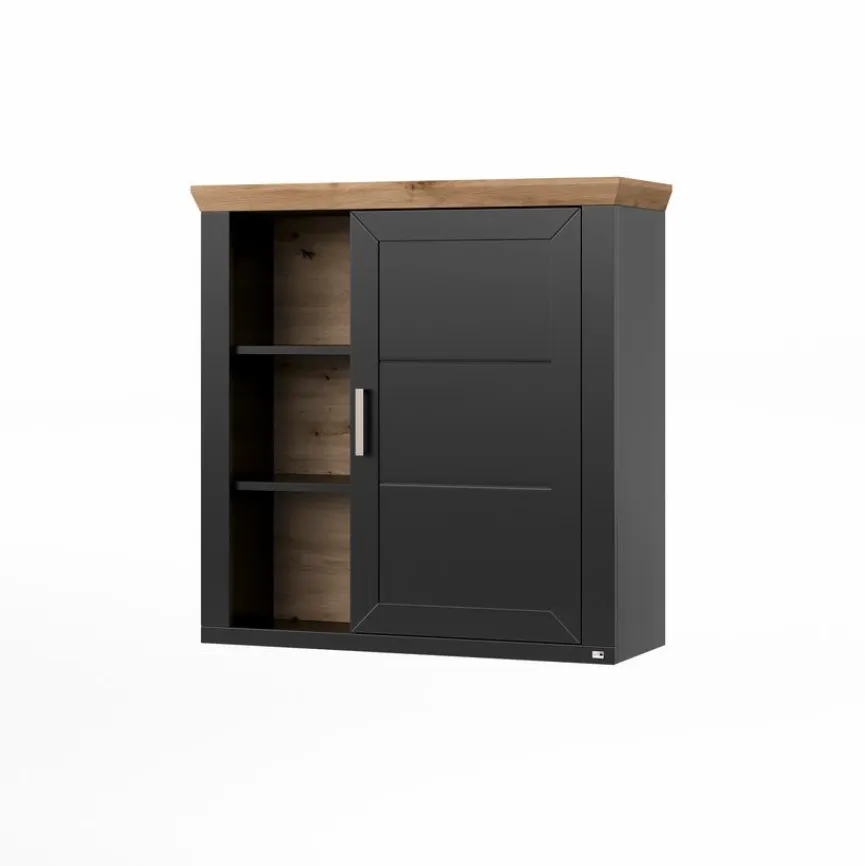 - Front aus Holzwerkstoff (MDF) in Graphit, Korpus aus Spanplatte mit kratzfester Melaminharzfolie in Graphit, Absetzung in Artisan Eiche Dekor