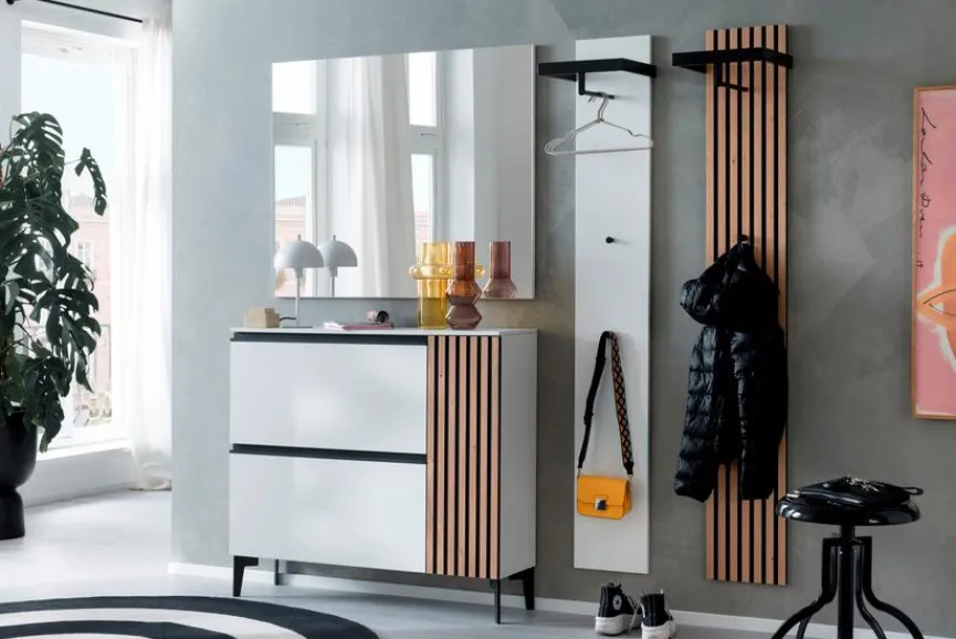 - Garderobe aus Klappen-Schuhschrank, Spiegel und 2 Garderobenpaneelen
