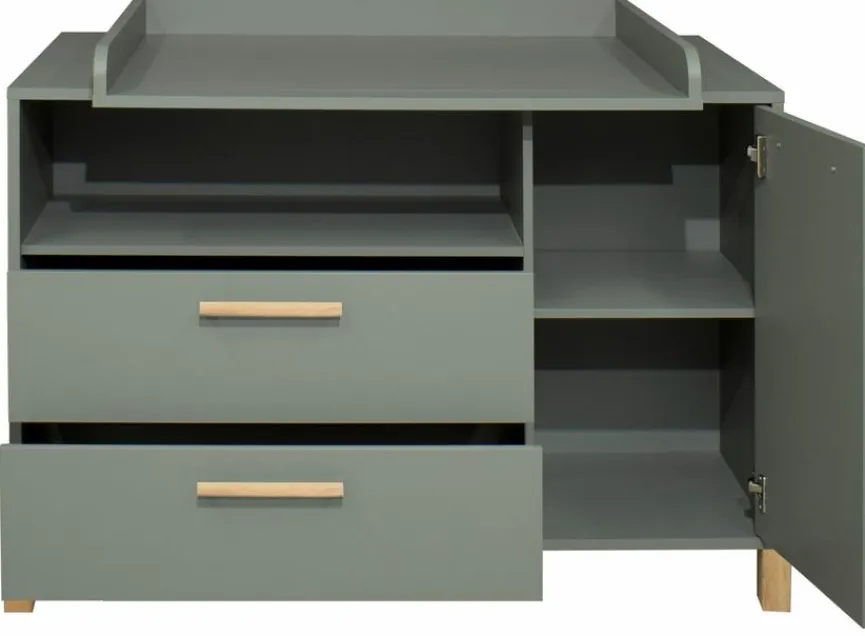 - Wickelkommode inkl. Wickelaufsatz, mit 1 Tür, 1 Einlegeboden, 2 Schubkästen und 1 offenen Fach