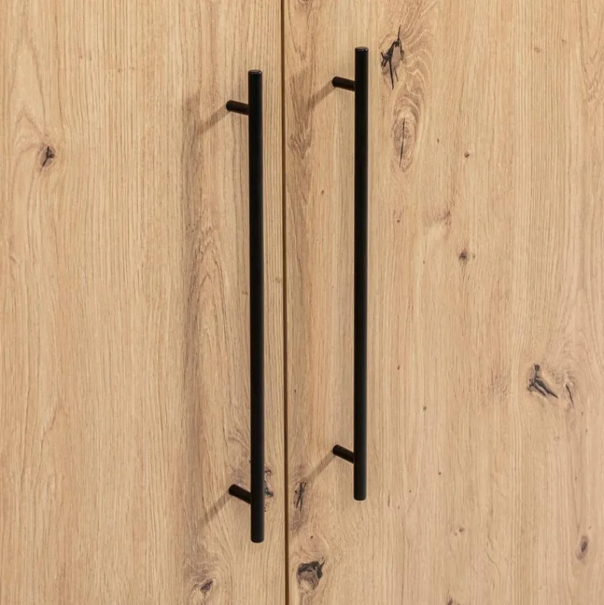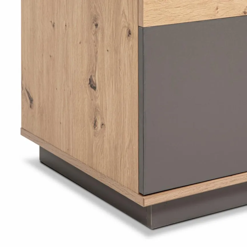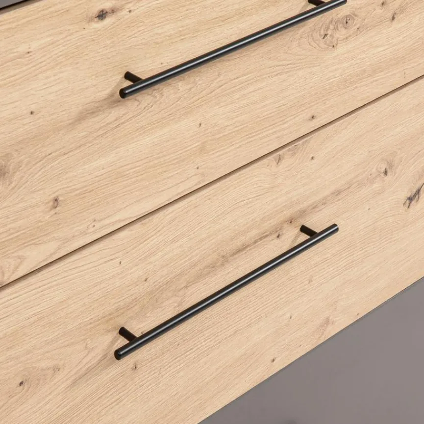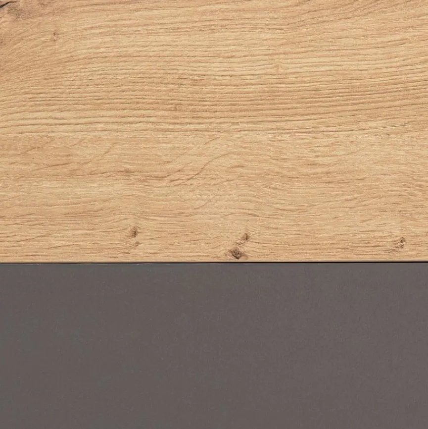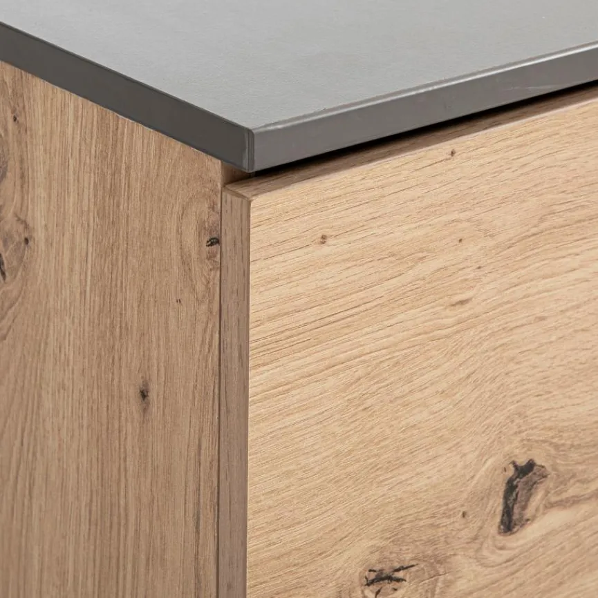 - Aus Holzwerkstoff (Spanplatte) mit hochwertiger Dekorfolie in „Kent Eiche“, Absetzung aus Holzwerkstoff (Spanplatte) mit hochwertiger Dekorfolie in Anthrazit, Griffe aus Metall in anthrazit