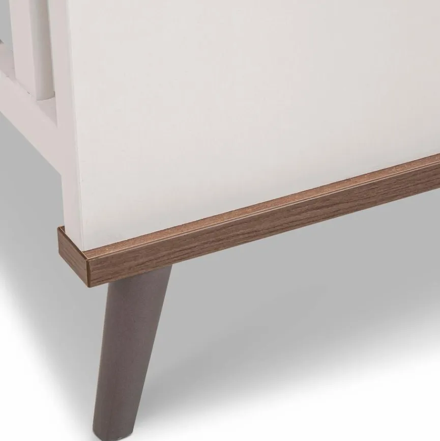 - Aus Holzwerkstoff (Spanplatte) mit kratzfester Melaminharzfolie in Off-White, Gitterseiten aus massiver und in Off-White lackierter Buche, Absetzungen aus Holzwerkstoff (Spanplatte) mit kratzfester Melaminharzfolie in Dark Walnut