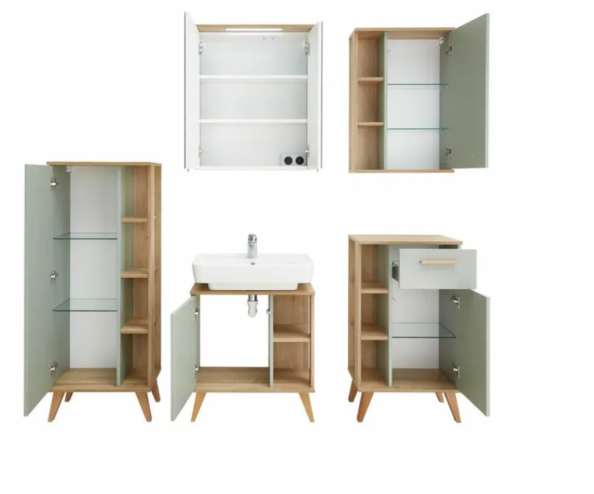 - Bestehend aus Waschbeckenunterschrank mit 1 Tür und seitliche Ablagefächer, Spiegelschrank mit 2 Türen und LED-Beleuchtung