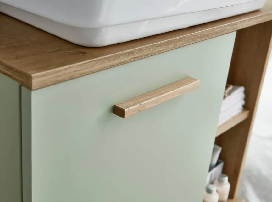 - Front aus Spanplatte mit Melaminharzfolie in Salbei, Korpus aus Spanplatte mit Melaminharzfolie in Salbei/Riviera Eiche quer Nachbildung